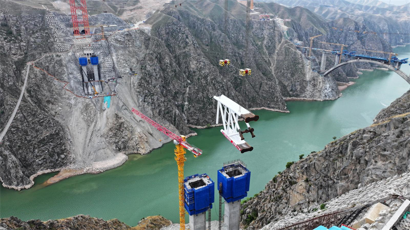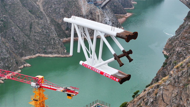 4月28日6時(shí)58分,隨著指揮哨聲落下,500噸級(jí)纜索吊機(jī)的鋼纜緩緩繃緊,一段重達(dá)200余噸的白色鋼管拱肋穩(wěn)穩(wěn)離開(kāi)地面,在施工人員的引導(dǎo)下精準(zhǔn)嵌入預(yù)定位置,我國(guó)西北地區(qū)最大跨度上承式鋼管混凝土拱橋——蘭永臨高速洮河特大橋主拱吊裝工程正式啟動(dòng),蘭西城市群交通建設(shè)再次按下“快進(jìn)鍵”。