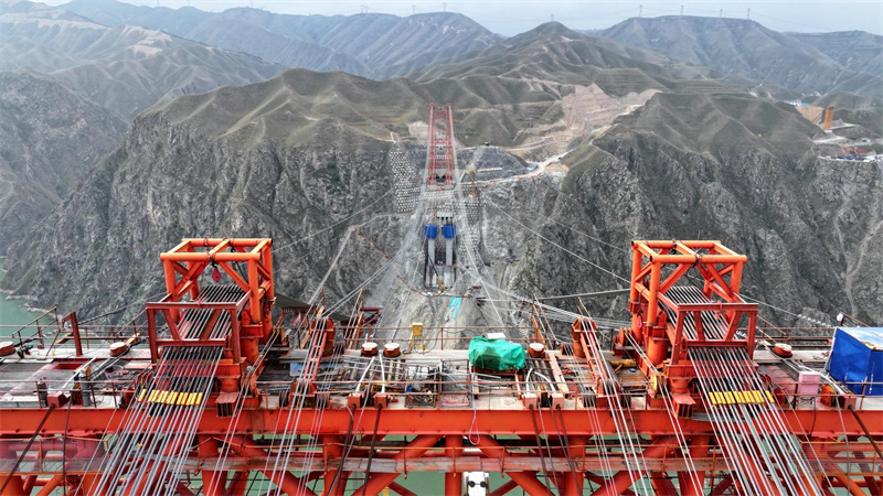 轟鳴的機(jī)械聲在峽谷間久久回蕩,170米高的橋墩如兩把巨楔嵌入兩岸崖壁,橋面上電焊火花不時(shí)亮起,操作人員在智能監(jiān)測(cè)屏前緊盯數(shù)據(jù),上百臺(tái)大型設(shè)備有序運(yùn)轉(zhuǎn),現(xiàn)場(chǎng)一派熱火朝天的建設(shè)景象。作為蘭永臨高速的“咽喉工程”,洮河特大橋全長(zhǎng)562.16米,主橋凈跨達(dá)400米,總用鋼量1.5萬(wàn)噸,橋面距河面相當(dāng)于55層樓高,技術(shù)難度位居國(guó)內(nèi)同類(lèi)型橋梁前列。